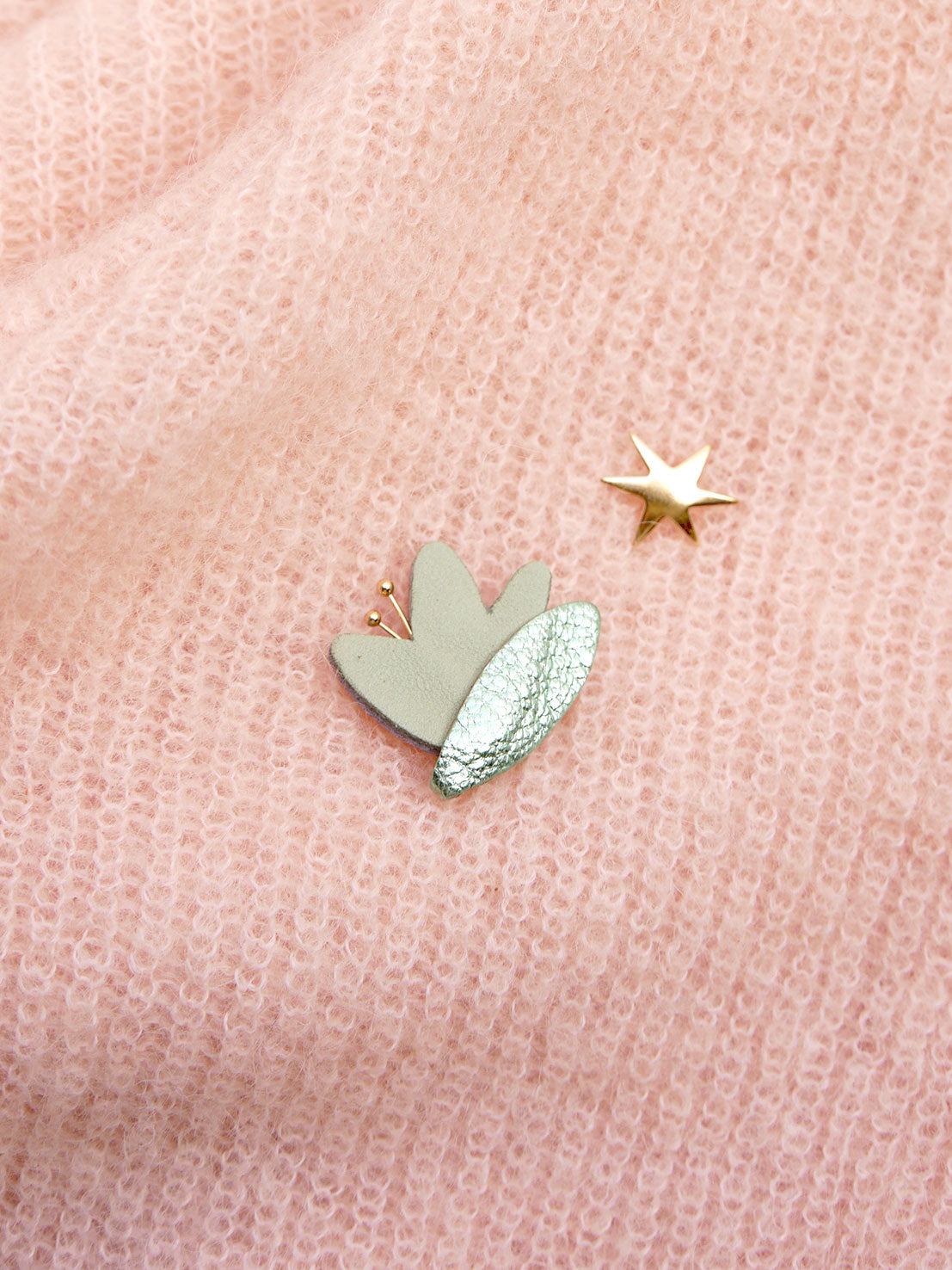 Ce pin's est en cuir vert amande lisse et cuir vert amande brillant.