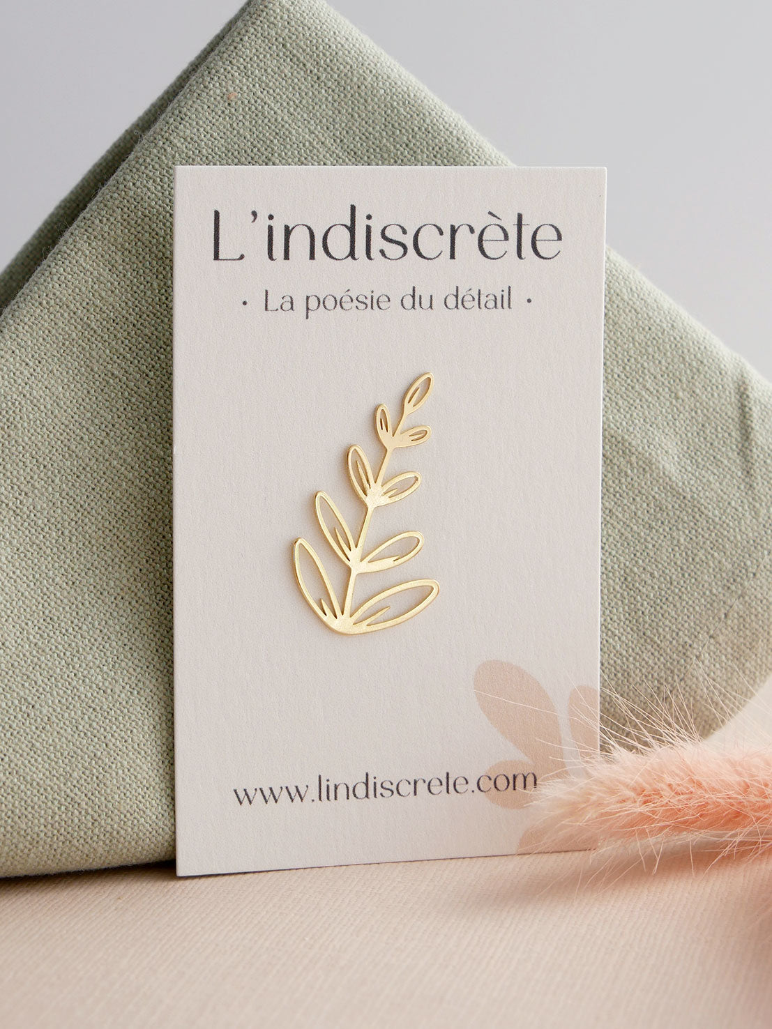 Un pin's végétal en laiton doré au design fin et minimaliste, inspiré de la nature et délicatement ajouré. Un bijou discret et raffiné qui sera parfait pour vos tenues du quotidien comme pour vos tenues plus habillées.